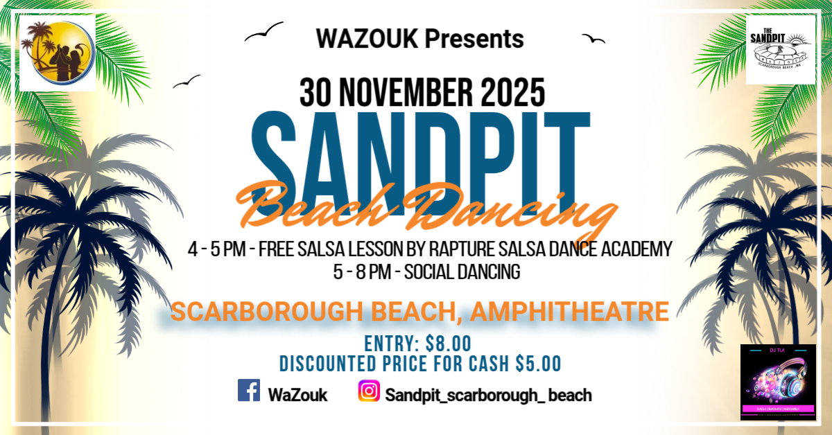 🎶 WAZouk Sunday Sandpit Dancing – 2025! 🎶 Subject to City of Stirling confirmation 📍 Scarborough Beach Amphitheatre 🗓️ Sunday, 30 November 2025 🕒 4:00 PM – 8:00...